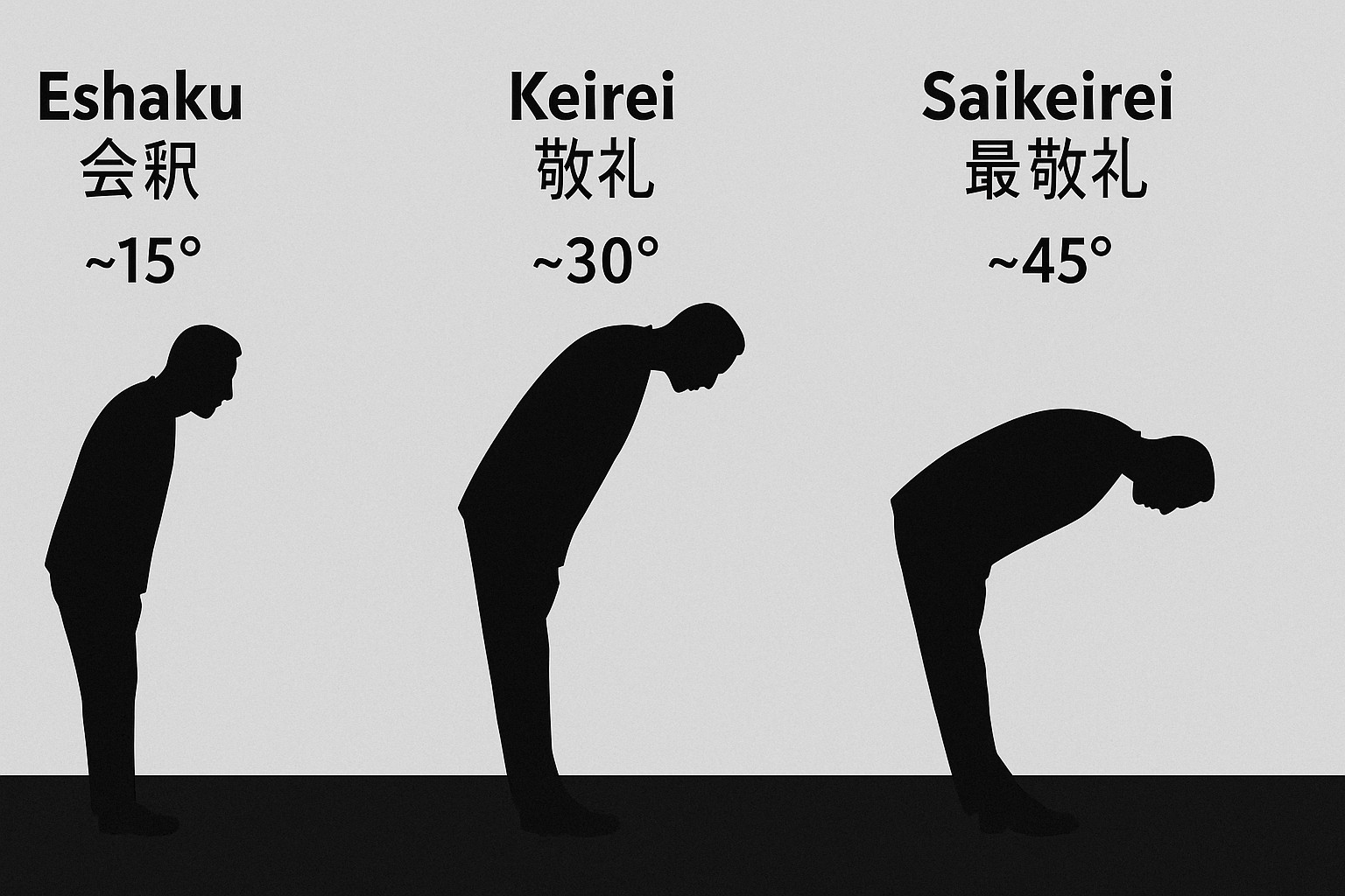 A meghajlás mélysége a kifejezett tisztelet, alázat és társadalmi helyzet függvénye. A japán etikettben az alábbi alapfokozatokat különböztetik meg: